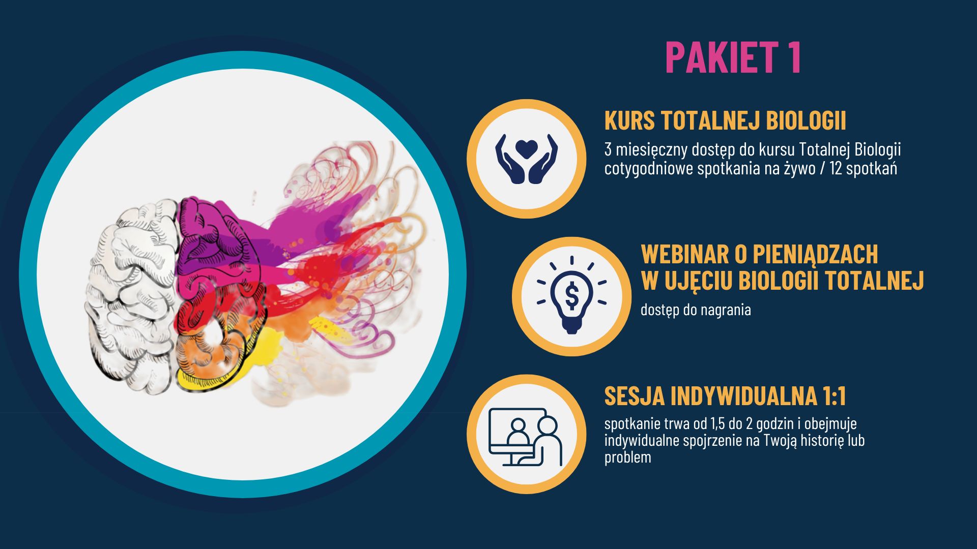 Pakiet 1 – pełny dostęp do 3 miesięcy kursu „Dlaczego Twoje ciało choruje? Dowiedz się, co zaprogramowało Twoją chorobę i pożegnaj ją raz na zawsze!”. W sumie 12 spotkań, w tym 4 w lutym, 4 w marcu, 4 w kwietniu. Otrzymasz także dostęp do webinaru o pieniądzach w ujęciu Biologii Totalnej, a także możliwość skorzystania z sesji online 1:1.